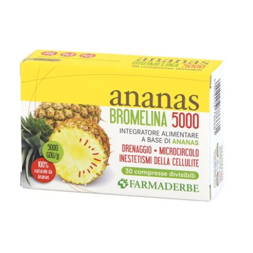 Ananas Bromelina 5000 Integratore 30 compresse è un complemento alimentare formulato da Farmaderbe, pensato per supportare il benessere dell’organismo attraverso l’apporto di bromelina, un enzima proteolitico naturalmente presente nel gambo dell’ananas. Questo integratore è indicato per chi desidera favorire i processi fisiologici dell’organismo legati alla digestione delle proteine, al drenaggio dei liquidi corporei e alla normale funzionalità dei tessuti.