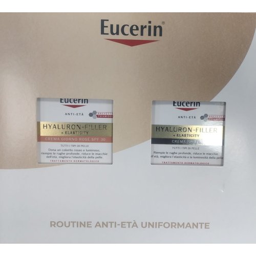Il Eucerin Cofanetto di Natale Elasticity Rosè Routine Anti-Età Uniformante è stato ideato per rispondere alle necessità della pelle matura che presenta discromie, perdita di elasticità e rughe profonde. Questo set natalizio, elegante e completo, comprende due formulazioni dermocosmetiche avanzate appartenenti alla linea Hyaluron-Filler + Elasticity, sviluppata per migliorare il tono cutaneo, conferire uniformità cromatica e sostenere la struttura della pelle.