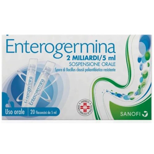 Enterogermina 20 flaconcini 5 ml è un probiotico a base di spore di Bacillus clausii (2 miliardi per flaconcino), prodotto dall’azienda farmaceutica Sanofi. È un medicinale utile per ristabilire l’equilibrio della flora batterica intestinale alterata da terapie antibiotiche, disturbi intestinali o errori alimentari.