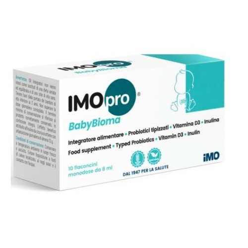 IMOpro Babybioma Integratore DI Probiotici 10 flaconcini Da 8ml è un integratore alimentare probiotico formulato specificamente per il benessere della flora intestinale del lattante e del bambino. Il prodotto è pensato per supportare l’equilibrio del microbiota intestinale nei primi anni di vita, una fase particolarmente delicata per lo sviluppo del sistema digerente e immunitario.