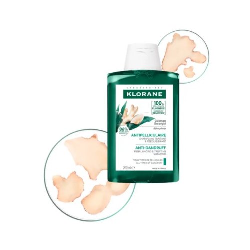 Klorane Shampoo Trattante e Riequilibrante alla Galanga 200ml è un prodotto dermocosmetico formulato per combattere la forfora e riequilibrare il cuoio capelluto sensibile. Grazie all'estratto di Galanga (Alpinia galanga), noto per le sue proprietà lenitive e purificanti, questo shampoo offre un effetto antiforfora efficace e delicato, riducendo la sensazione di prurito e il disagio cutaneo associato. I principali benefici dell'utilizzo del prodotto sono:
